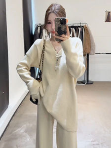 慵懒风气质V领华夫格上衣阔腿裤女装2025秋冬新款巨好看休闲套装